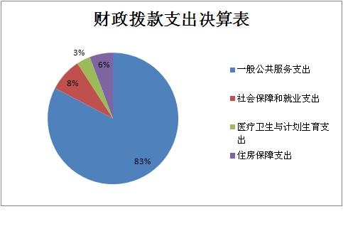 2016年度財政撥款支出決算總計118.46萬元,其中:一般公共服務(類)支出97.76萬元,占83%;社會保障和就業(類)支出9.7萬元,占8%;醫療衛生與計劃生育(類)支出4.01萬元,占3.3%;住房保障(類)支出6.79萬元,占5.7%。