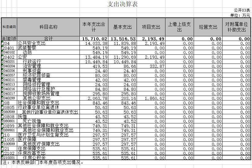公共安全(類)公安(款)行政運(yùn)行(項(xiàng))。主要反映用于維持社會治安,打擊犯罪等支出。年初預(yù)算為9483萬元,支出決算為9228.75萬元,完成年初預(yù)算的97.32%。決算數(shù)與年初預(yù)算基本持平。