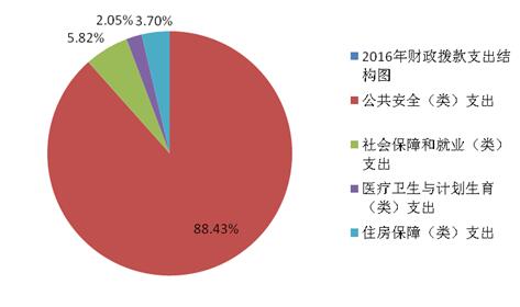 2016年度財(cái)政撥款支出決算總計(jì)14488.93萬元,其中:公共安全(類)支出12812.29萬元,占88.43%;社會保障和就業(yè)(類)支出843.46萬元,占5.82%;醫(yī)療衛(wèi)生與計(jì)劃生育(類)支出297.57萬元,占2.05%;住房保障(類)支出535.61萬元,占3.7%。