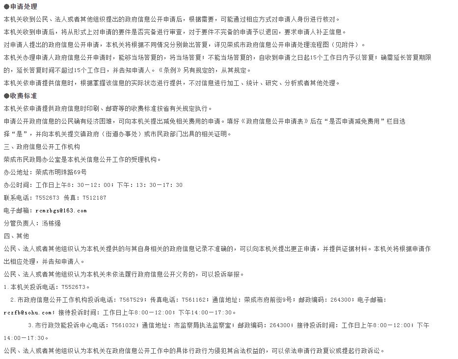 按照為民、便民、利民的原則,在政府信息公開過程中,榮成市民政局所有紙質(zhì)公開資料全部免費(fèi),其他資料郵寄等費(fèi)用根據(jù)情況而定,原則上予以減免。