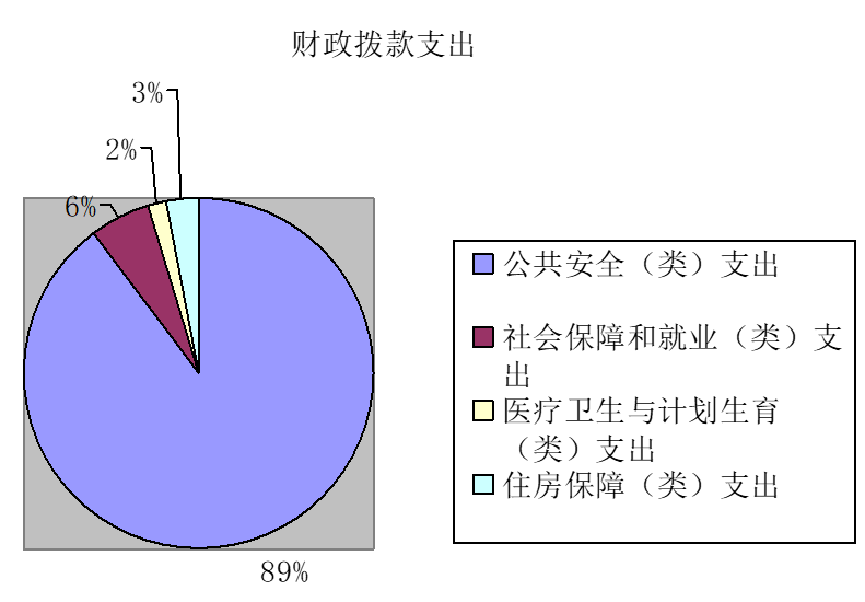 2018年財政撥款支出預算為5826.6萬元,比上年預算數增加1145.6萬元,主要原因是2017年道路交通設施等項目預算已安排但由于項目未完成而未下達,所以結轉到2018年預算支出。其中:公共安全支出(類)支出5230.9萬元,占89.78%;社會保障和就業支出(類)支出328.5萬元,占5.64%;醫療衛生與計劃生育支出(類)支出95.1萬元,占1.63%;住房保障支出(類)支出172.1萬元,占2.95%。