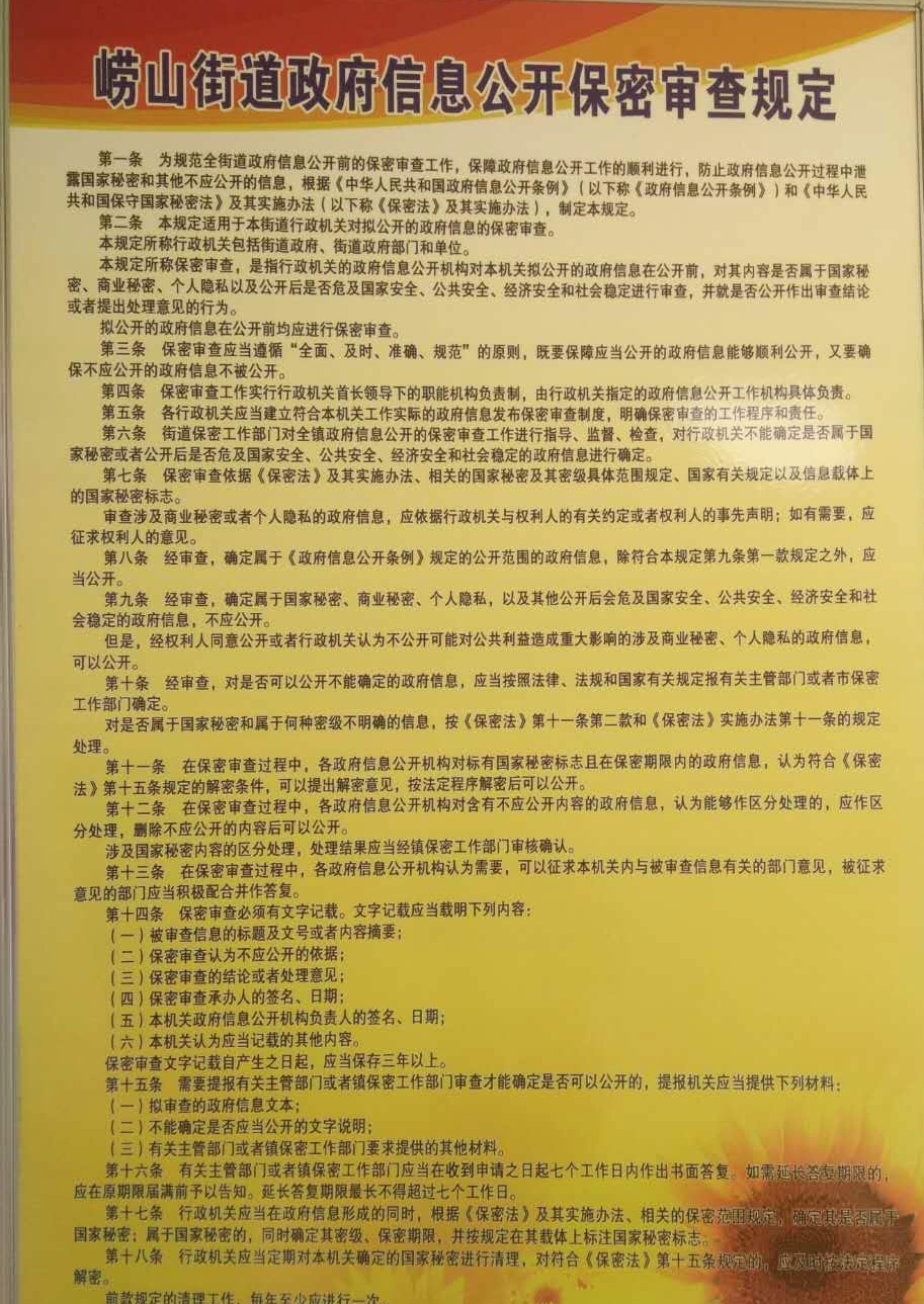 接到上報相關(guān)公開信息后,榮成市嶗山街道保密部門對擬發(fā)信息進行保密安全審核,在確認所提交內(nèi)容為可公開內(nèi)容后,再由信息公開小組專職人員對信息進行公開,形成了及時對擬定公開材料進行事前保密審查、事后監(jiān)督檢查,確保所有公開信息準確無誤、符合要求的工作機制。