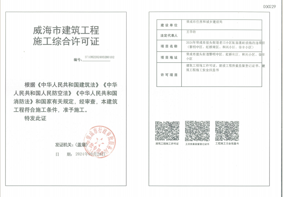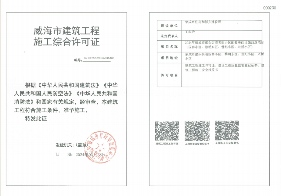 2024年 榮成市崖頭街道老舊小區配套基礎設施改造項目質量安全監督信息