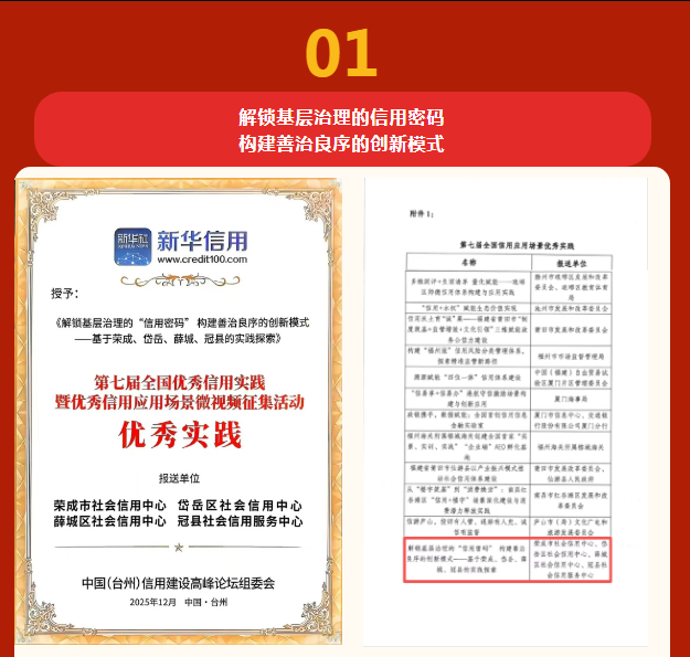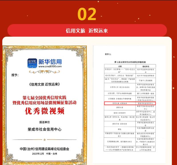 近日,在中國城市信用建設(shè)高峰論壇上,論壇組委會(huì)公布了第七屆全國優(yōu)秀信用實(shí)踐暨優(yōu)秀信用應(yīng)用場(chǎng)景微視頻名單,共確定全國信用應(yīng)用場(chǎng)景優(yōu)秀實(shí)踐194個(gè),全國信用應(yīng)用場(chǎng)景優(yōu)秀微視頻54個(gè)。山東省作品入選15個(gè),威海共入選4個(gè),榮成市占有2個(gè)獲獎(jiǎng)名額。《解鎖基層治理的“信用密碼” 構(gòu)建善治良序的創(chuàng)新模式》榮獲全國信用應(yīng)用場(chǎng)景優(yōu)秀實(shí)踐,《信用文旅 近悅遠(yuǎn)來》榮獲全國優(yōu)秀信用應(yīng)用場(chǎng)景微視頻。