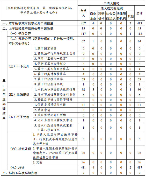 2.依申請公開工作方面。依法依規(guī)做好全市政府信息依申請公開工作,加強(qiáng)對政府信息公開申請接收、登記、補(bǔ)正、審核、答復(fù)、存檔等環(huán)節(jié)管理,穩(wěn)步提升依申請公開工作質(zhì)量。2025年,全市共辦理依申請公開417件(含上年結(jié)轉(zhuǎn)13件),與去年相比數(shù)量增加168件。本年度共收到政府信息公開申請方面的行政復(fù)議25件,結(jié)果維持10件,結(jié)果糾正5件,其他結(jié)果9件,尚未審結(jié)1件;未收到政府信息公開申請方面的行政訴訟件。